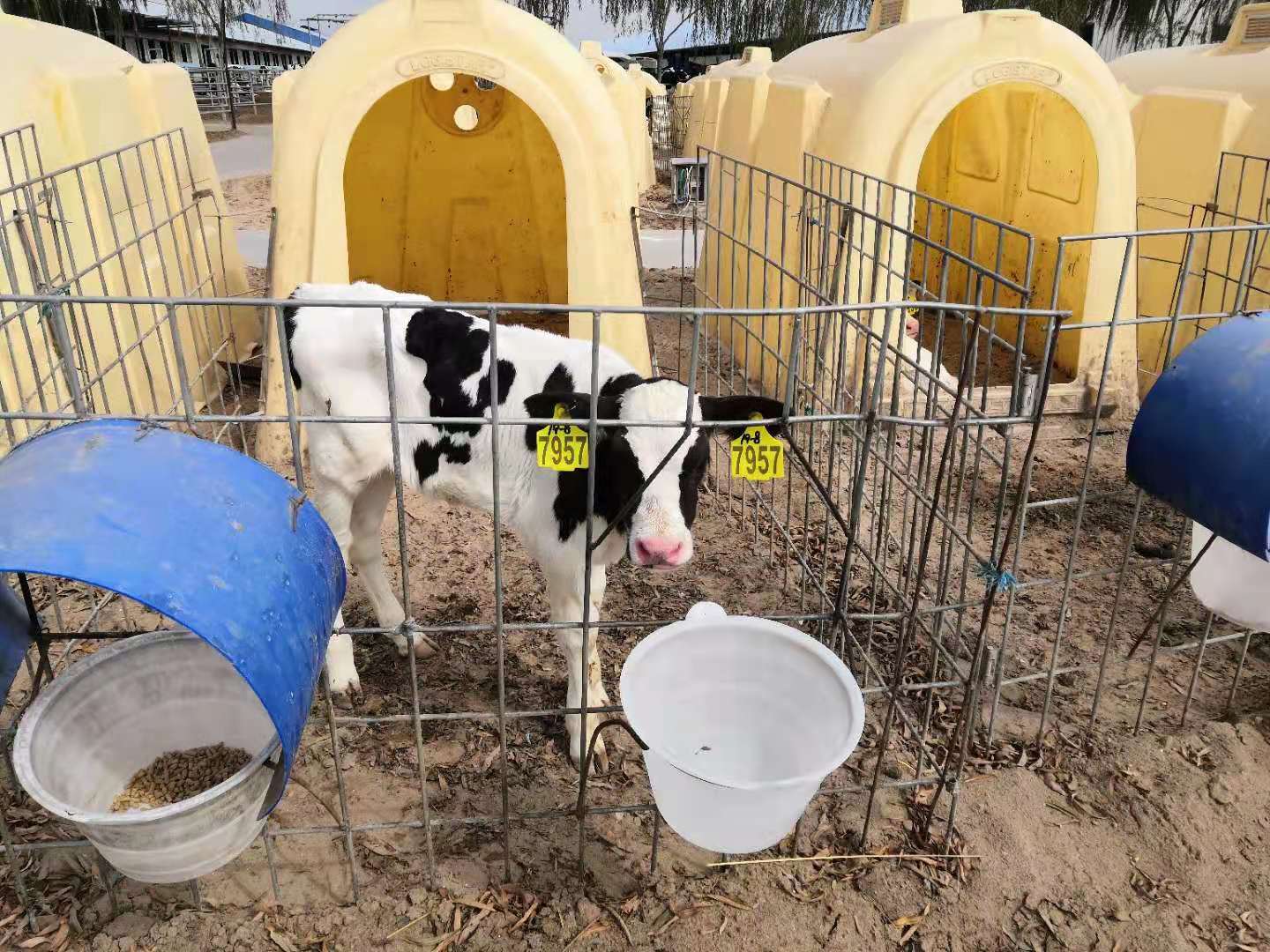 在初生牛犊区域内,饲养员驾驶一辆自动配比牛奶的运输电动车正在给小牛犊喂奶。喂奶量由智能机器掌握,解放了人工,又可以保证小牛犊的食量适量,科技感十足。